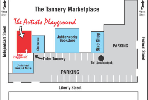 The Artists Playground is located in Mill #1 of the Tannery Marketplace, just inside the door to the left of Chococoa Baking Company. It is best to park in the lot on the Liberty Street side.